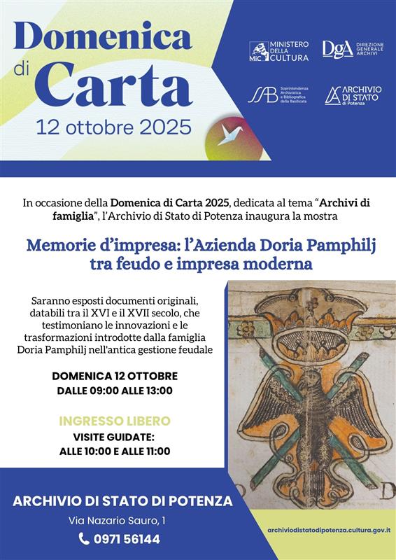 Anche quest’anno l’Archivio di Stato di Potenza partecipa alla Domenica di Carta, l’iniziativa promossa dal Ministero della Cultura che ogni ottobre coinvolge archivi e biblioteche statali, offrendo ai cittadini l’opportunità di riscoprire la ricchezza e il valore del patrimonio documentario italiano.